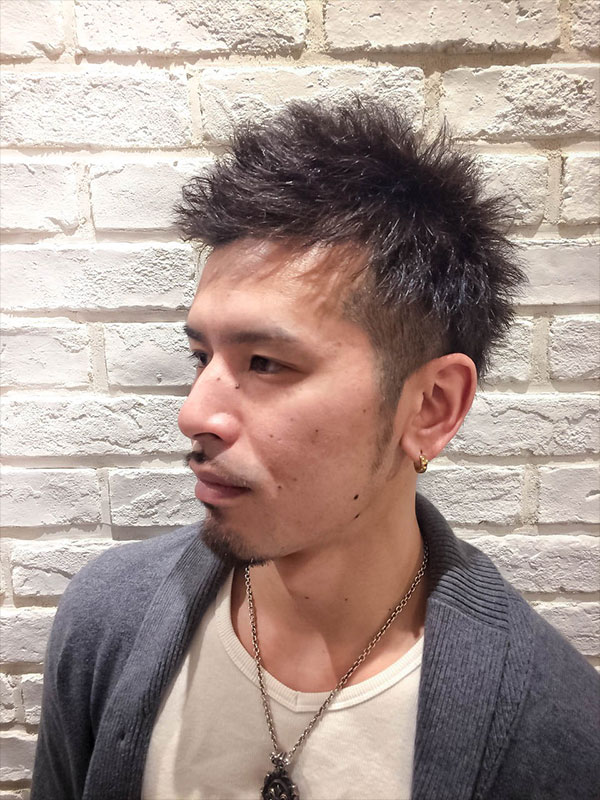 サイドは2ブロック。バック&サイドはすっきりさせ、ツヤ感をプラスしてソフモヒ感と束感を強調。ダークアッシュブラウンでワイルドな雰囲気に。
